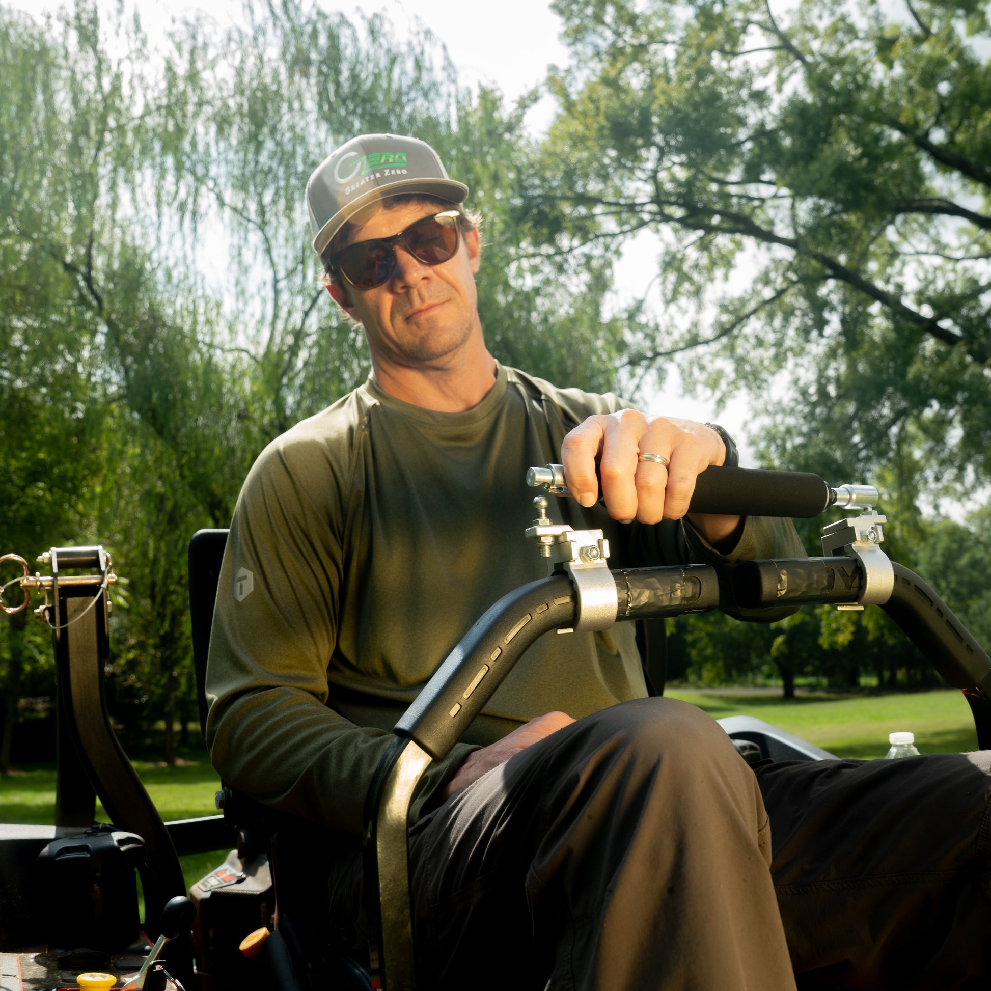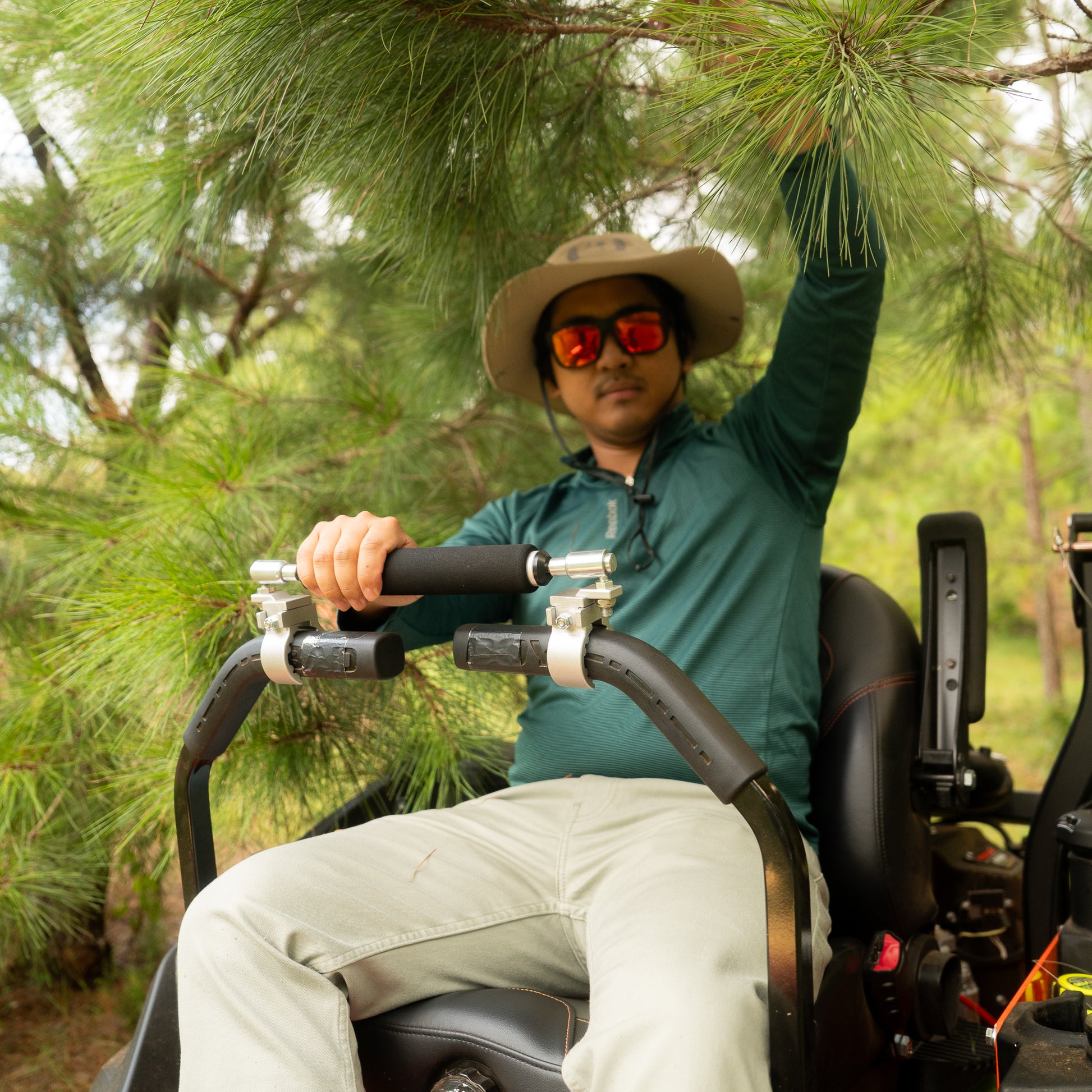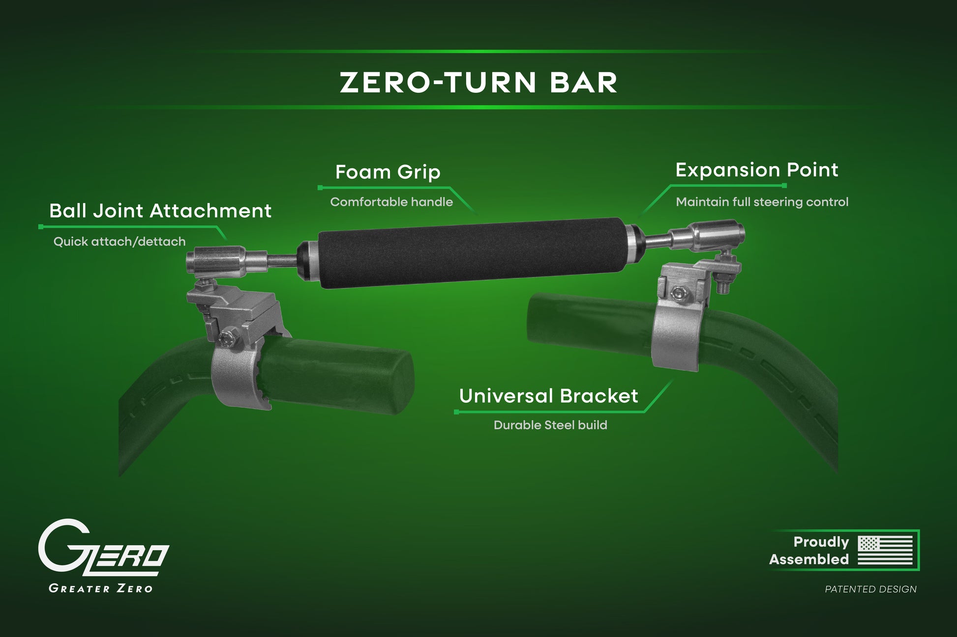 The Zero-Turn Bar is a patented, innovative tool for zero-turn mowers. It enables operators to steer their mower with just one hand, without compromising the mower's complex steering capabilities. Intuitive, durable, and easy to install, the Zero-Turn Bar offers efficiency and comfort during mowing tasks.